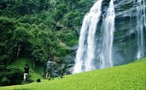 Widest waterfall in Sri Lanka, surrounded by misty hills.